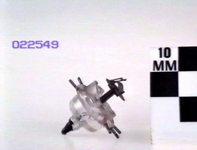 Cylindrical bulb with five radial pins with exhaust tip on short end. Top of bulb has been removed. Mounted on wooden display block with ST 022548