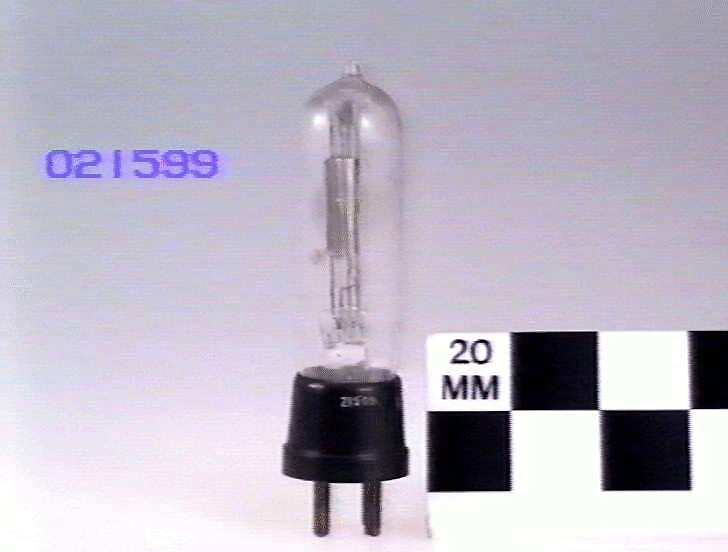Tall cylindrical bulb on small 4 pin UX style base, mounted on display block. Exhaust tip on top appears to be broken. Red spot on bulb indicates the selection group of the valve,