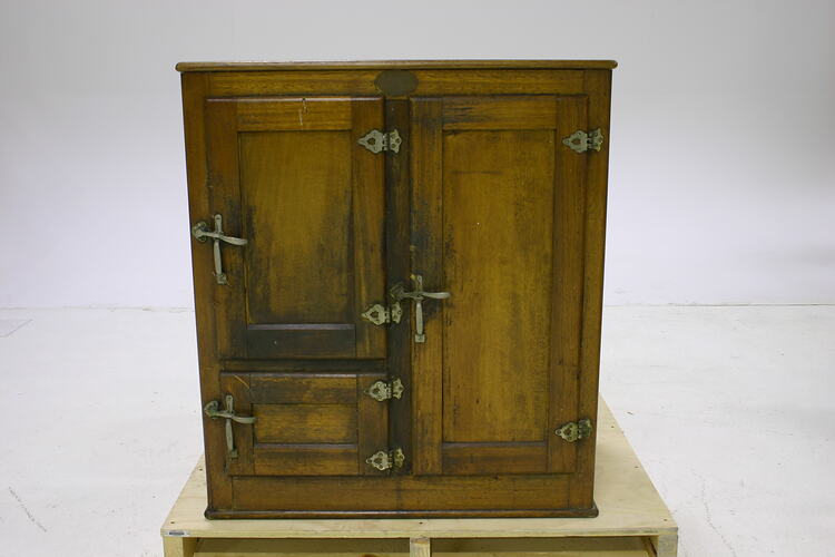 A wooden unit upon an external, electric powered motor. FRONT: upper centre, metal disk applied. Doors: 3 , 1 full-height on right, 2 on left. All hinged at right with decorative hinge plates and brackets. HANDLES - D-shaped with lever locking mechanism. BACK: sealed with metal/ copper piping and electrical cord emanating from small hole upper right. INTERIOR: compartments and doors lined with metal sheeting. Green baize seal around doors. Behind right door, 1 compartment with 2 removable wire shelves. Behind bottom left door, single compartment with metal tray on base. Behind upper left door, top right temperature dial, black dial on black metal plate. FREEZER COMPARTMENT - 2 shallow compartments for ice trays; 1 tray and two cube inserts in compartments. A metal disk applied to top of freezer unit. REFRIGERATION UNIT: coiled piping around air conditioning unit and motor, seated upon a wooden platform with four tapering triangular, metal legs. The support painted a green/ grey metallic colour.