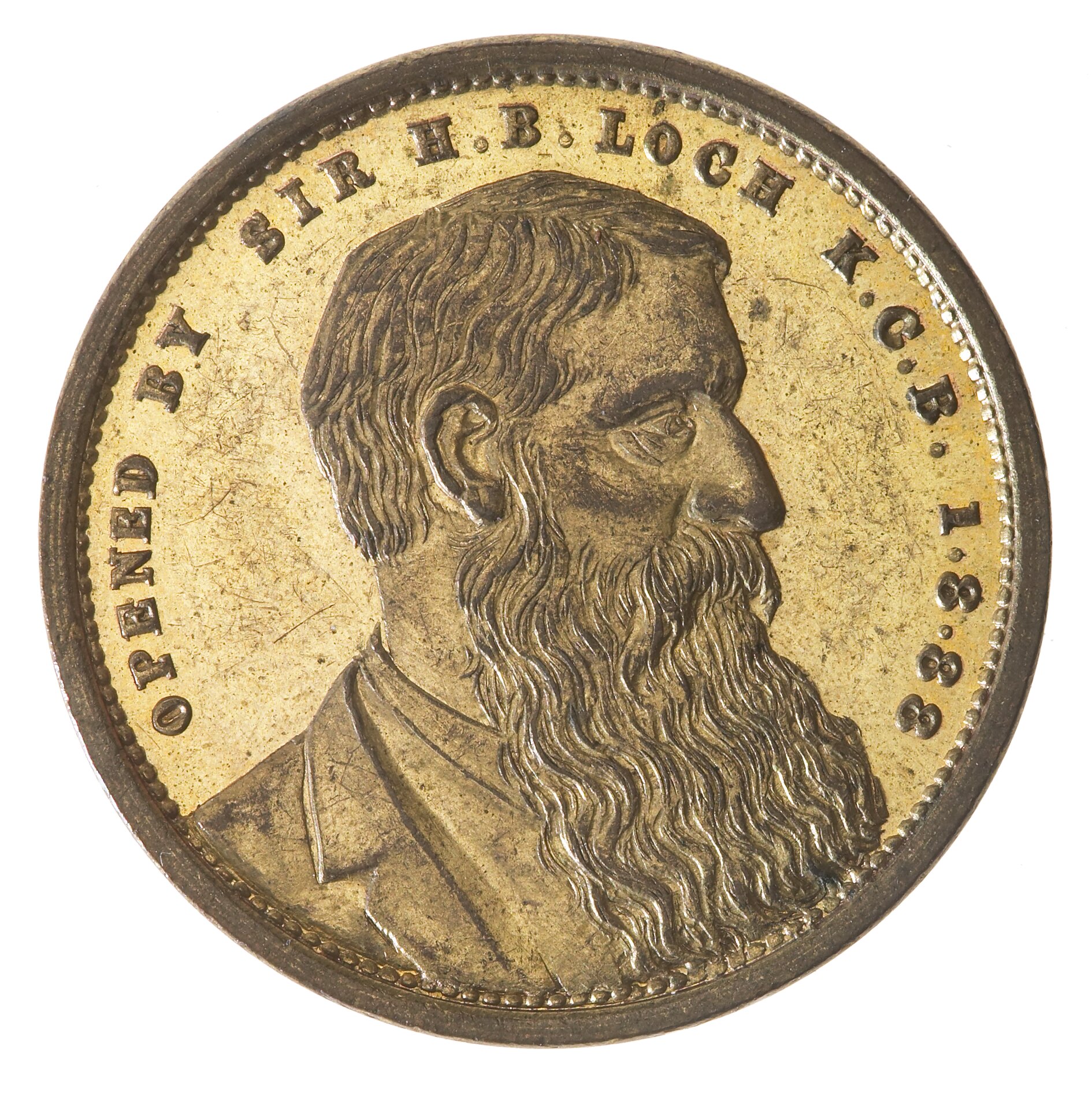 Bust of Sir Henry Loch facing right with long beard with the legend around, OPENED BY SIR H.B. LOCH K.C.B. 1.8.88