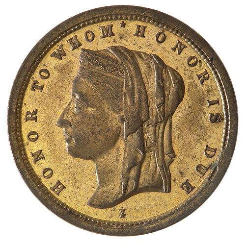 Head of Queen Victoria left, veiled and wearing coronet, around, HONOR TO WHOM * HONOR IS DUE *