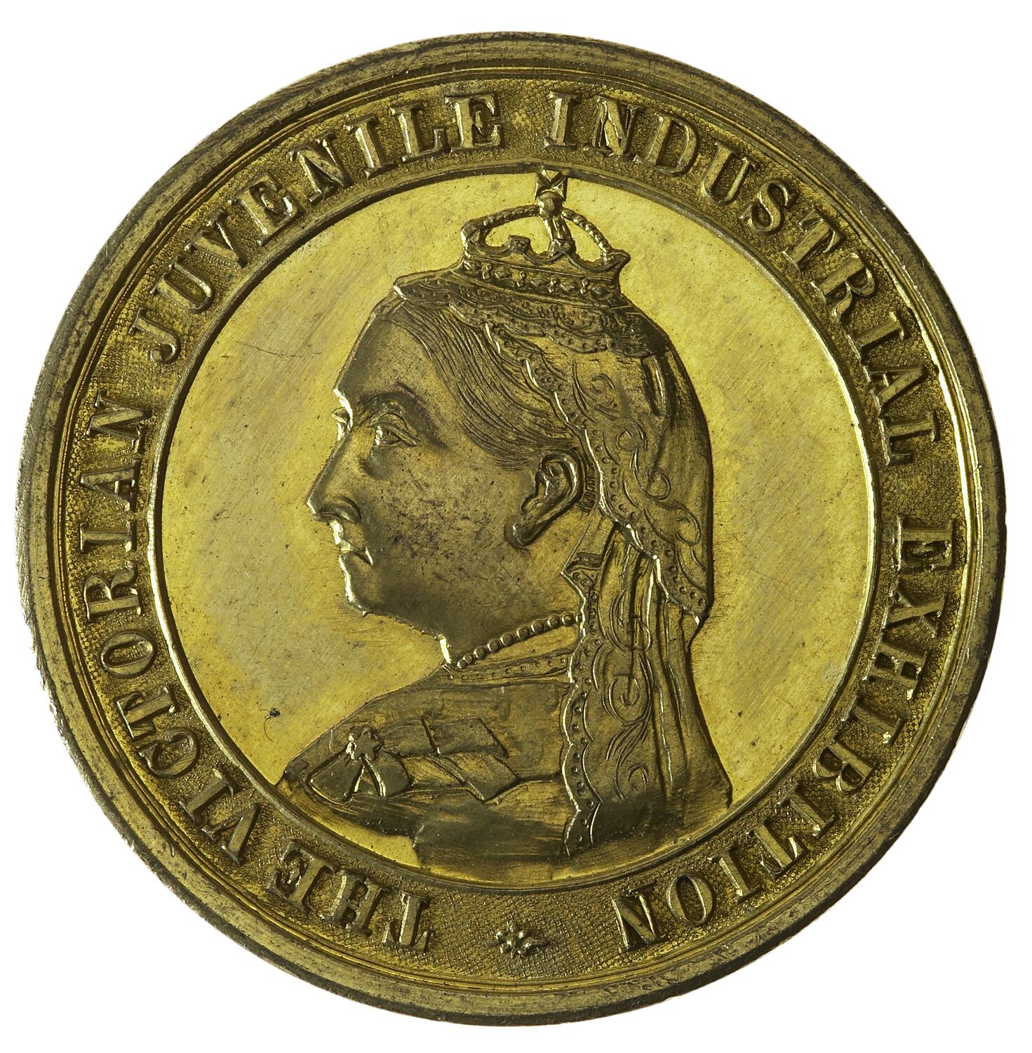 At centre within a broad rim, bust of Queen Victoria wearing small crown and veil, facing left; around on broad rim, THE VICTORIAN JUVENILE INDUSTRIAL EXHIBITION *