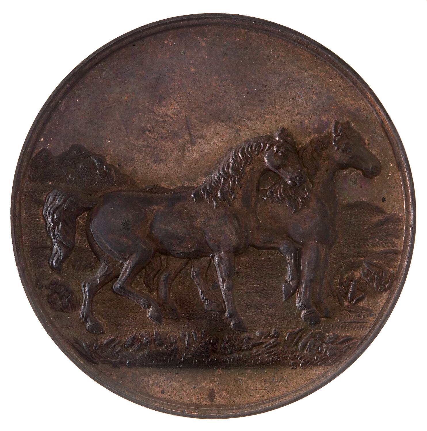 An unissued bronze prize medal (45 mm diameter) featuring two horses set in a rural scene facing right together with the name of the society and space on the reverse within a floral wreath to engrave details of a prize.