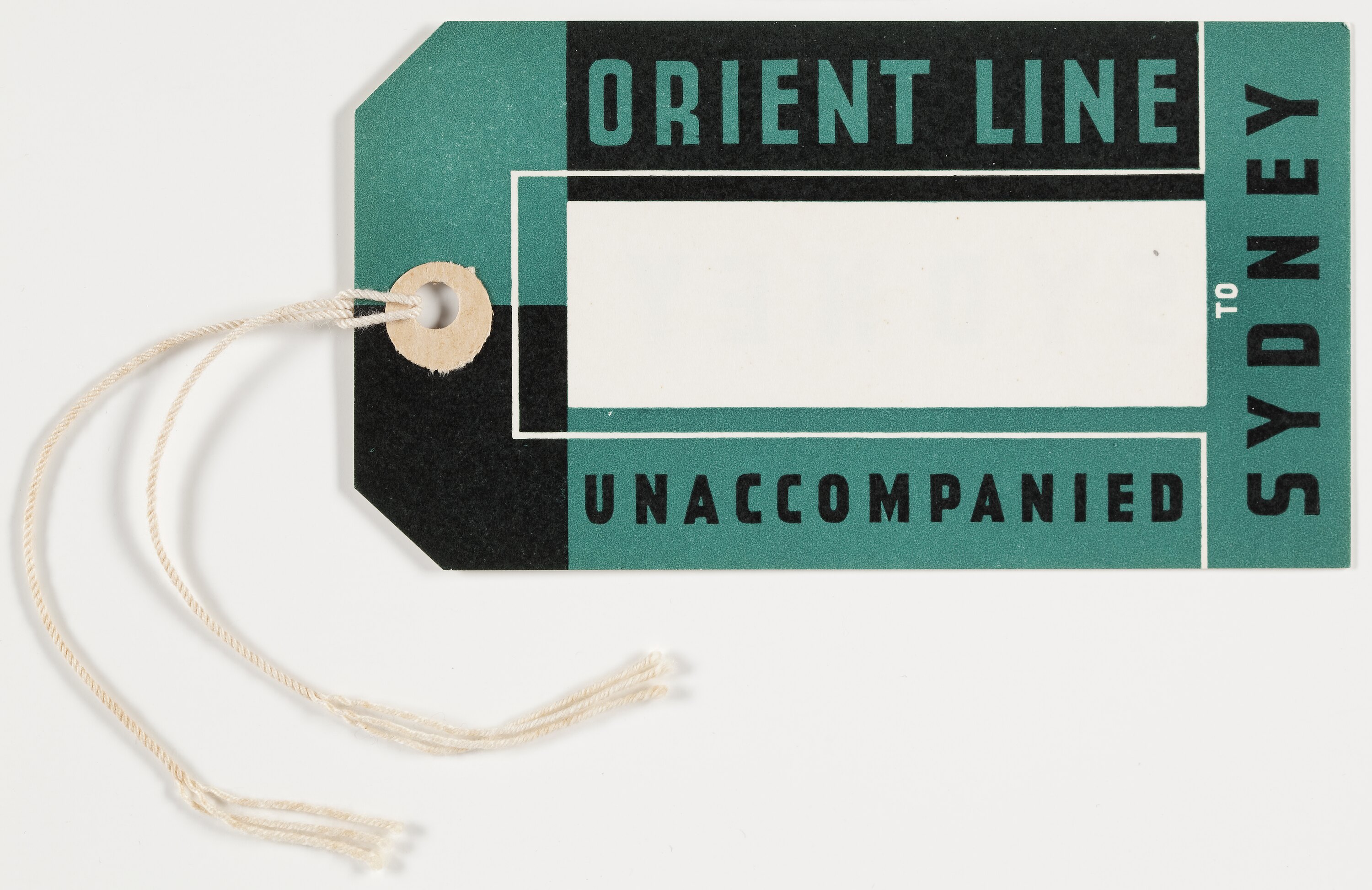Baggage label from the Orient Line, used circa 1950s. It is part of a collection of shipboard souvenirs collected by Margaret Wood an officer in the Department of Immigration from 1951-1960. As part of her role Margaret met migrant ships arriving at Station Pier in Melbourne and she often received gifts from ship staff