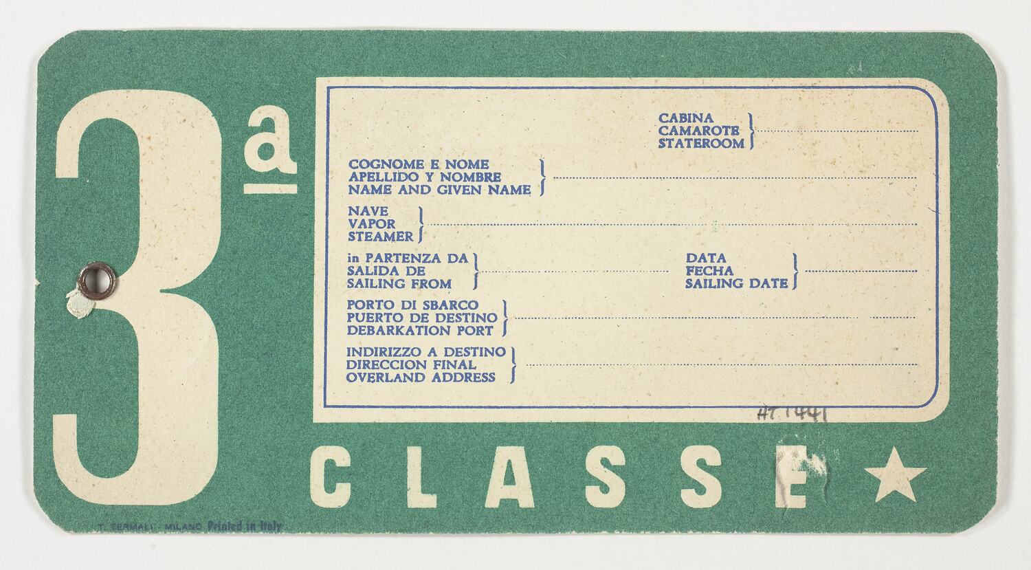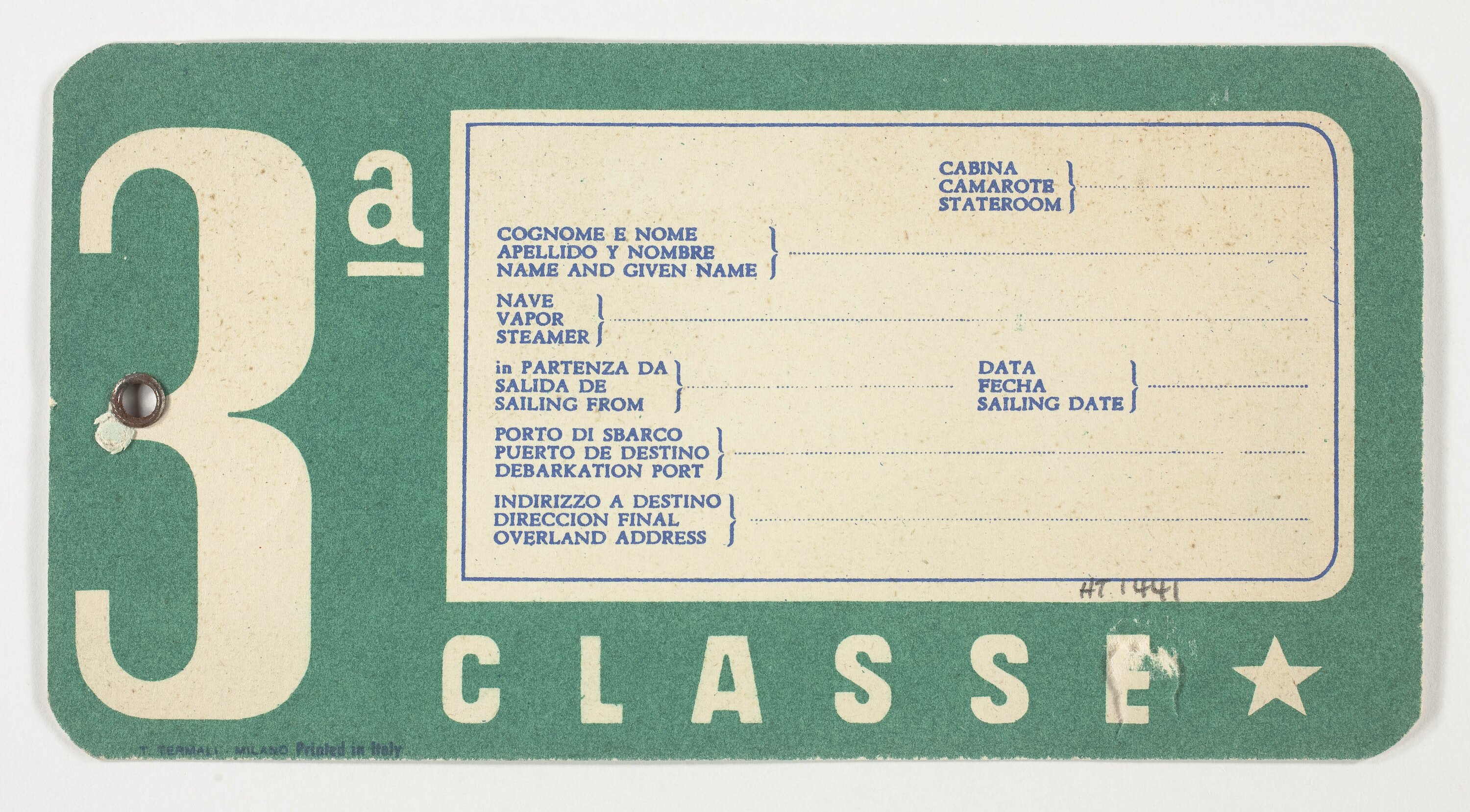 Baggage label for class 3A used on the Sitmar Line circa 1950. It is part of a collection of shipboard souvenirs collected by Margaret Wood an officer in the Department of Immigration from 1951-1960. As part of her role Margaret met migrant ships arriving at Station Pier in Melbourne and she often received gifts from ship staff