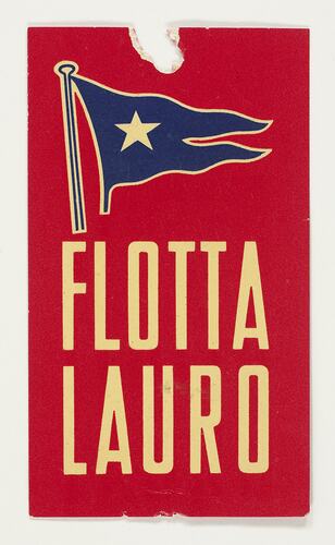 Flotta Lauro luggage label, used on the ship circa 1950s. It is part of a collection of shipboard souvenirs collected by Margaret Wood an officer in the Department of Immigration from 1951-1960. As part of her role Margaret often met migrant ships arriving at Station Pier in Melbourne and she often received gifts from ship staff