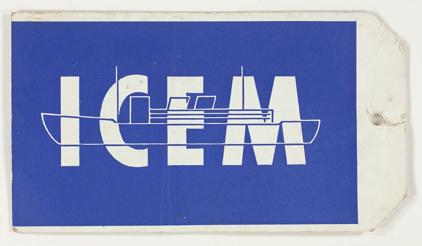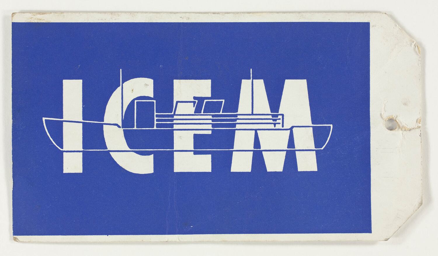 Baggage label from the Intergovernmental Committee for European Migration (ICEM). It was used by migrant Emil Haraszt who migrated to Australia in March 1957. It is part of a collection of shipboard souvenirs collected by Margaret Wood an officer in the Department of Immigration from 1951-1960. As part of her role Margaret met migrant ships arriving at Station Pier in Melbourne and she often received gifts from ship staff