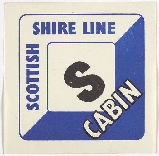 Cabin Baggage Label used on the Scottish Shire Line circa 1950s. It is part of a collection of shipboard souvenirs collected by Margaret Wood an officer in the Department of Immigration from 1951-1960. As part of her role Margaret met migrant ships arriving at Station Pier in Melbourne and she often received gifts from ship staff