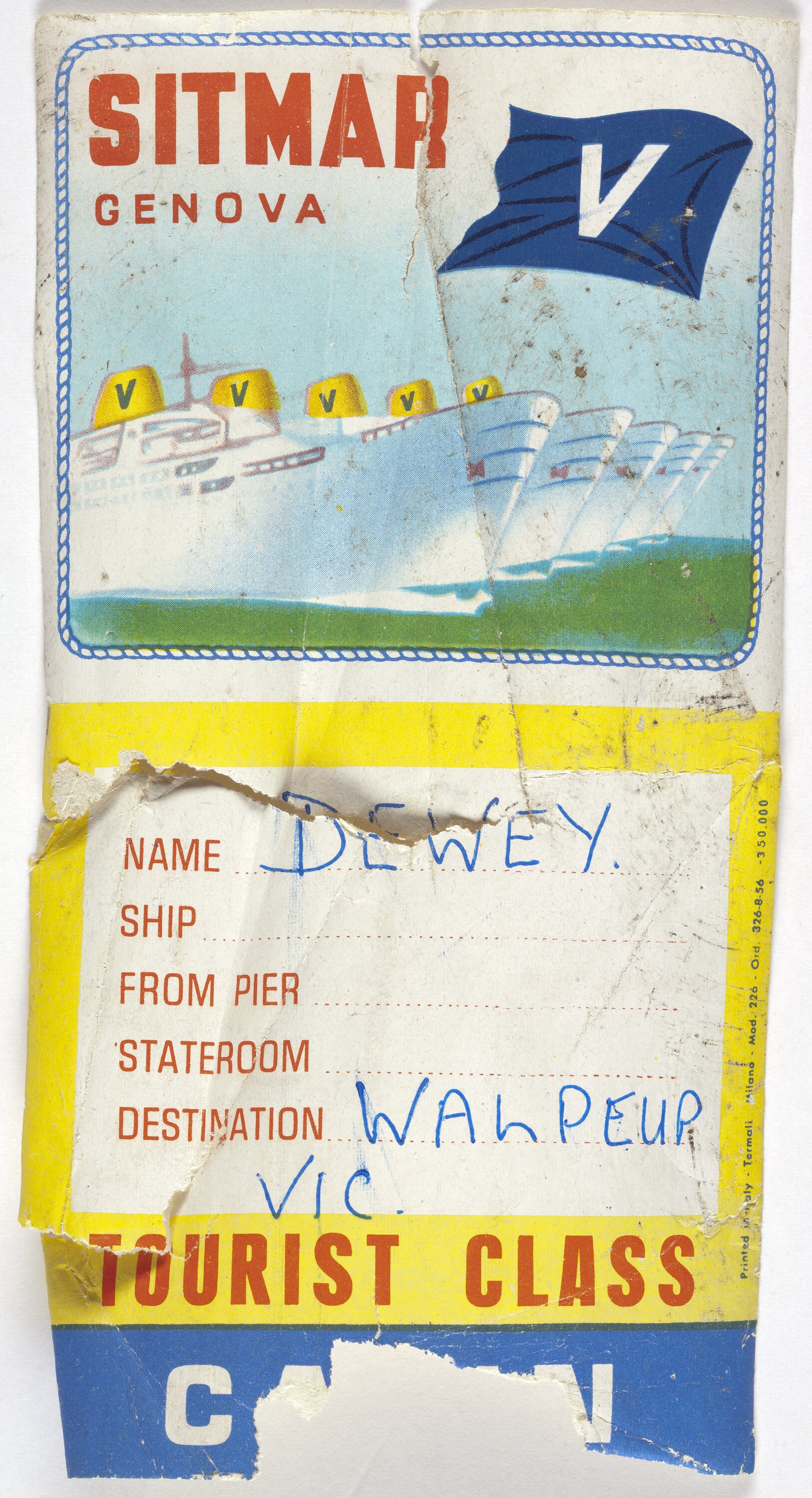 Text: SITMAR/GENOVA/NAME DEWEY/SHIP/FROM PIER/STATEROOM/DESTINATION WALPEUP/VIC/TOURIST CLASS.