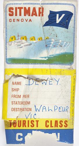 Baggage label used on the Sitmar Line circa 1950 in Tourist Class. It was used by a migrant with the surname Dewey. It is part of a collection of shipboard souvenirs collected by Margaret Wood an officer in the Department of Immigration from 1951-1960. As part of her role Margaret met migrant ships arriving at Station Pier in Melbourne and she often received gifts from ship staff