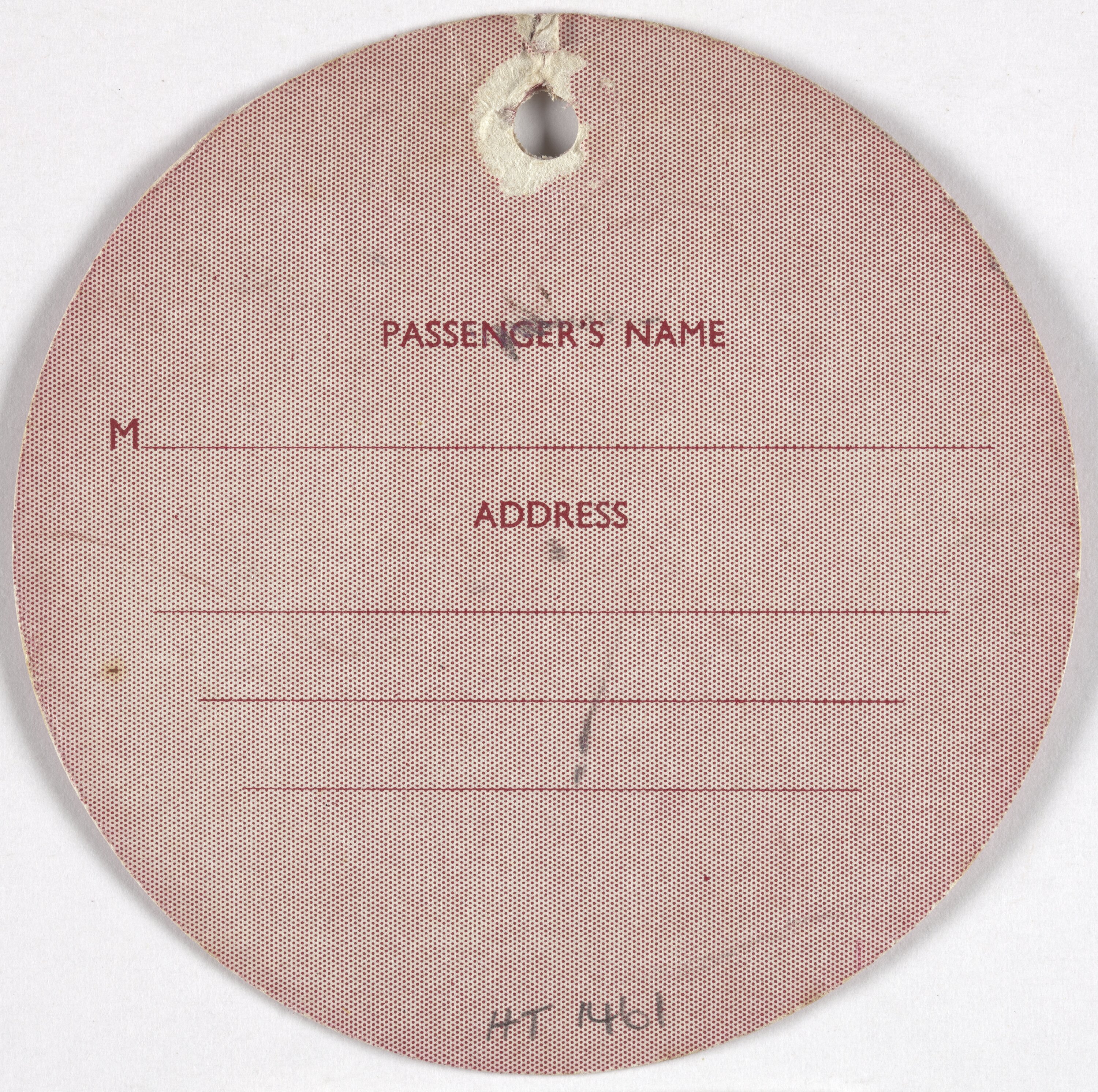 Round maroon coloured baggage label. Used. Completed in blue ink.