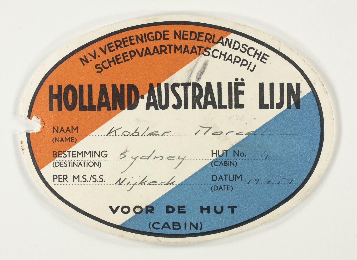 Cabin Baggage Label for the ship Nijkerk from the Dutch Shipping Company (N.V. Vereenigde Nederlandsche Scheepvaartmaatschapppij) on the Holland Australia Line. It was used by migrant Kobler Marcal on the 19 April 1959. It is part of a collection of shipboard souvenirs collected by Margaret Wood an officer in the Department of Immigration from 1951-1960. As part of her role Margaret often met migrant ships arriving at Station Pier in Melbourne and she often received gifts from ship staff