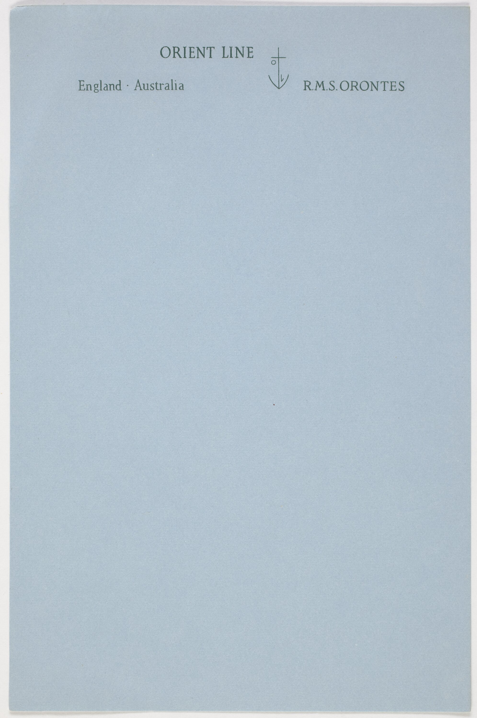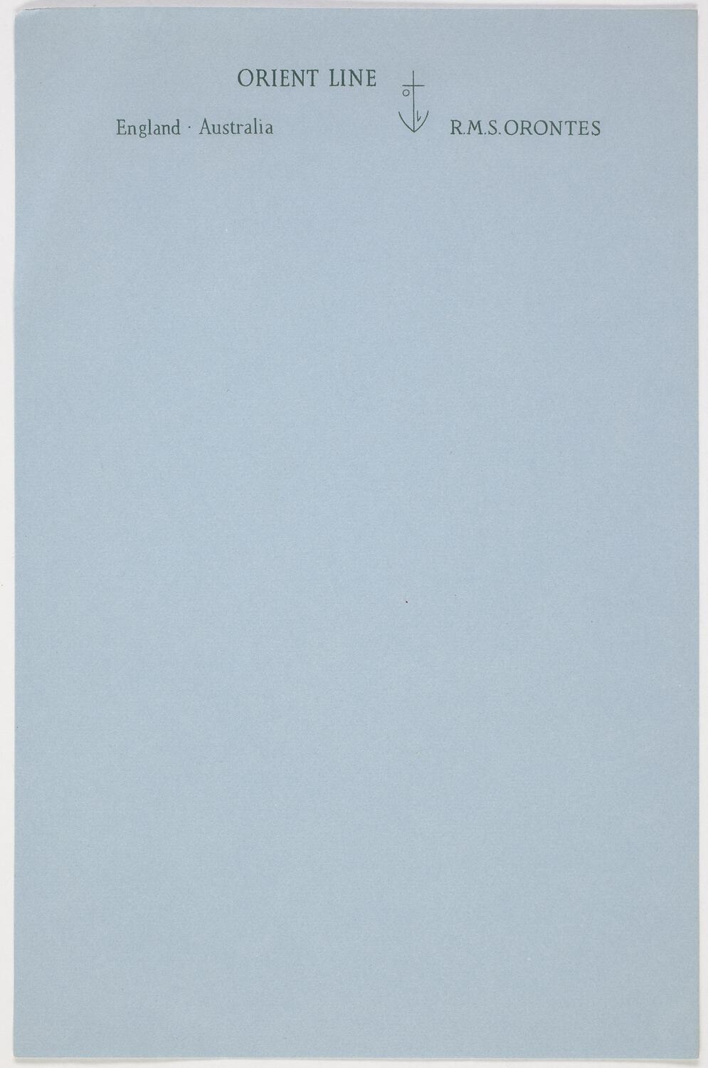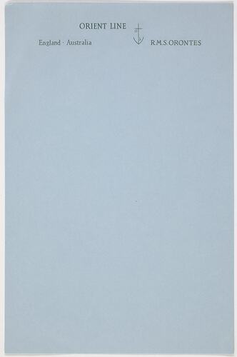 Notepaper provided for passengers correspondence on board the RMS Orontes. It was collected by Margaret Wood during her own leisure travelling, not as part of her work for the Department of Immigration. It is part of a collection of shipboard souvenirs collected by Margaret Wood an officer in the Department of Immigration from 1951-1960.