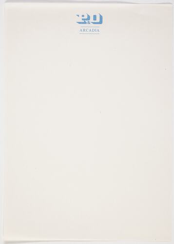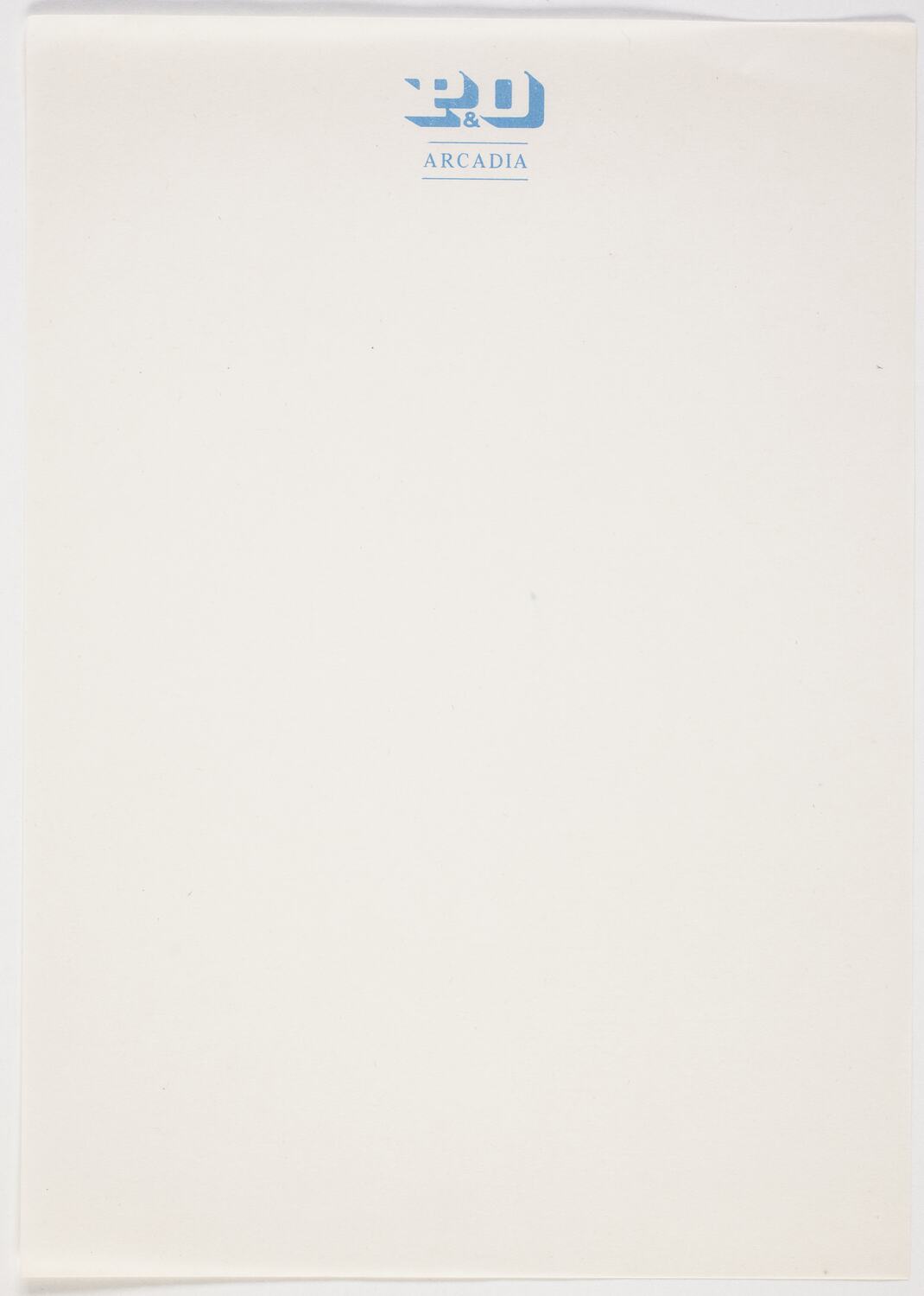 Ten sheets of notepaper provided for passengers correspondence on board the Arcadia. It was collected by Margaret Wood during her own leisure travelling, not as part of her work for the Department of Immigration. It is part of a collection of shipboard souvenirs collected by Margaret Wood an officer in the Department of Immigration from 1951-1960.
