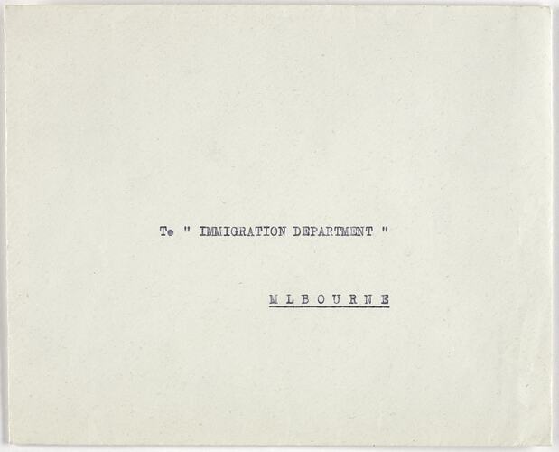 Text, front: To IMMIGRATION DEPARTMENT/Melbourne. Text, reverse: M/n FAIRSEA/AGENTI GENERALI/SITMAR/Societe Italiano Trasporti Maritimi S.p.A./GENOVA.