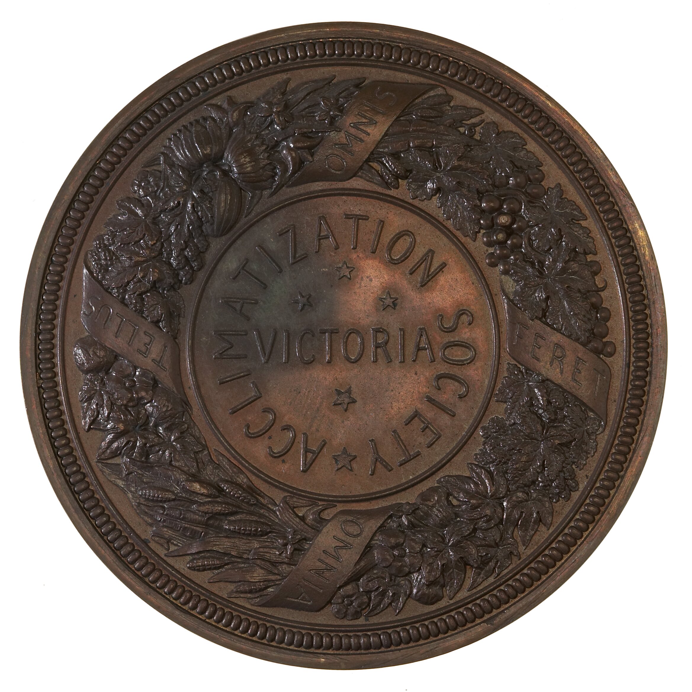 Obverse: ACCLIMATIZATION SOCIETY VICTORIA OMNIA TELLUS OMNES FERET Reverse: J.S. & A.B. WYON SC. 1868 T. LANSEER A.B.A. ADJ.