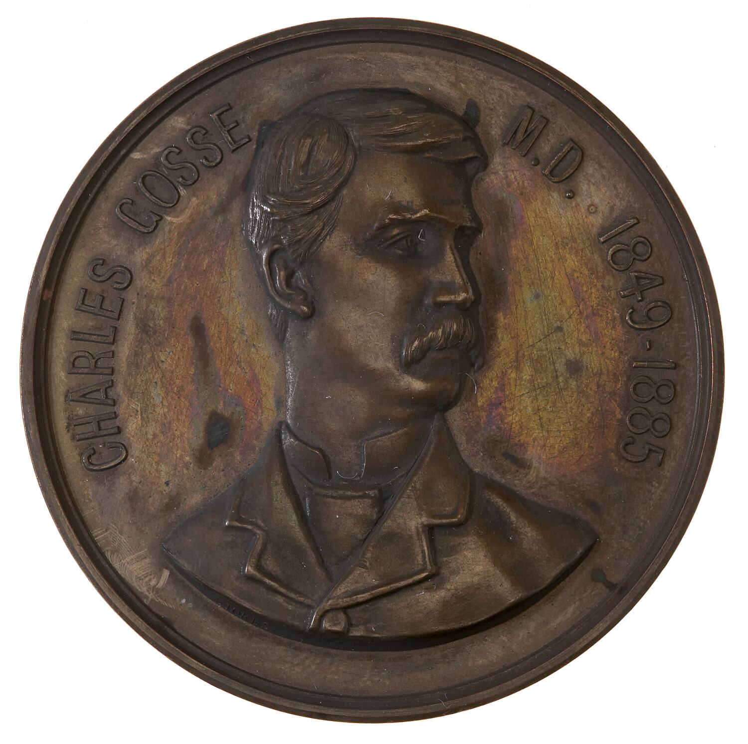 Bust of Gosse facing, head right, wearing a suit and cravat; around, CHARLES GOSSE M.D. 1849 - 1885