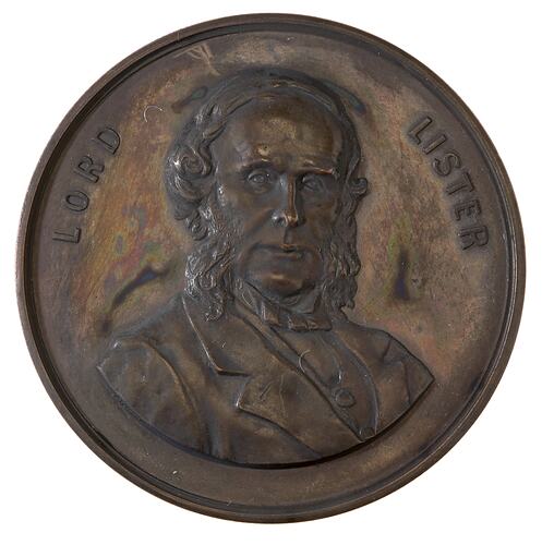 An unissued specimen bronze prize medal (54 mm diameter) featuring a facing bust of Lord Lister.
