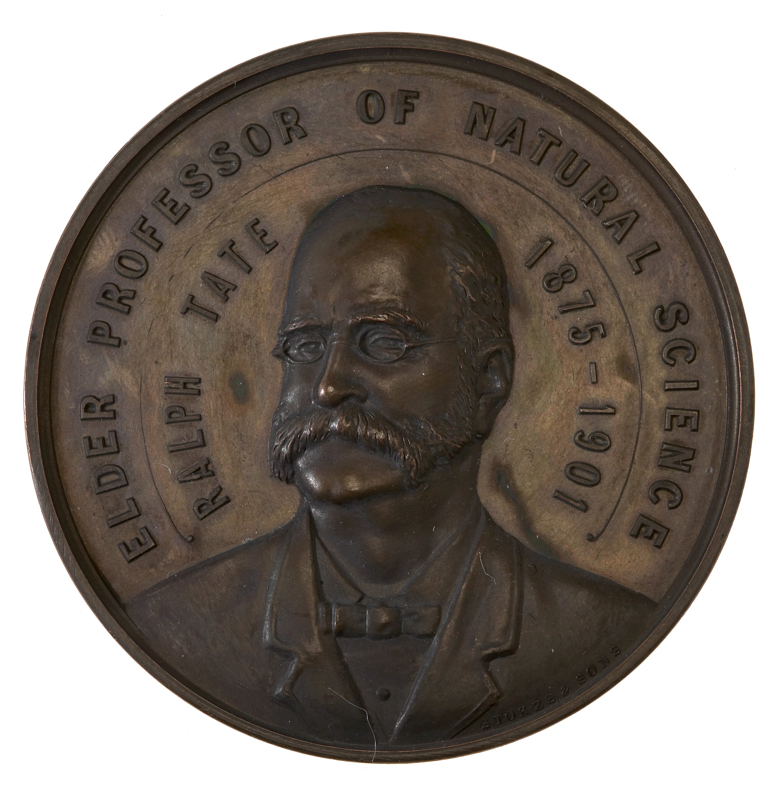 Bust of Tate facing, head 3/4 left, wearing glasses, a suit and small bow-tie; around in two lines, ELDER PROFESSOR OF NATURAL SCIENCE / RALPH TATE 1875 - 1901; below in small letters the mint name, STOKES & SONS