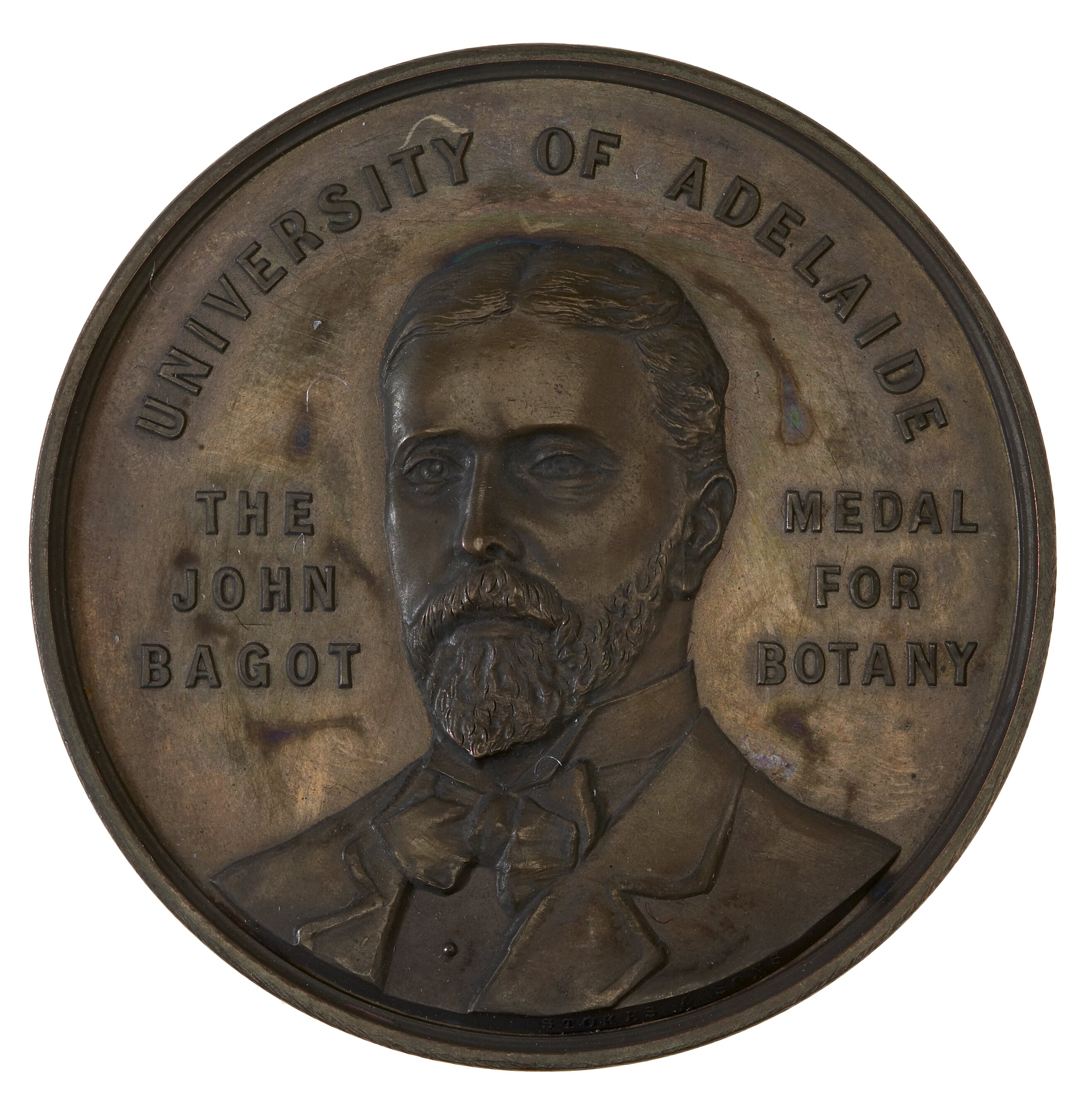 Bust of Tate facing 3/4 left bearded, wearing a suit and large bow-tie; around above, UNIVERSITY OF ADELAIDE; at left THE / JOHN / BAGOT , at right. MEDAL / FOR / BOTANY; in small letters on truncation of bust the mint name, STOKES & SONS
