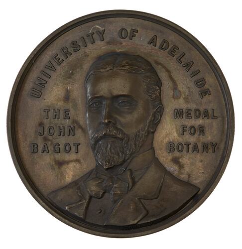 Other Details: University of Adelaide botany prize medal, issued around 1912. It features the bust of John Bagot. The prize was established by his wife, Mrs John Bagot, who donated $1,000 in memory of her late husband. The John Bagot Scholarship is awarded annually to the student who has passed with the highest aggregate mark for the subjects Biology I and Environmental Biology I. If two or more students obtain an equal aggregate score then the $300 prize is shared equally amongst them.