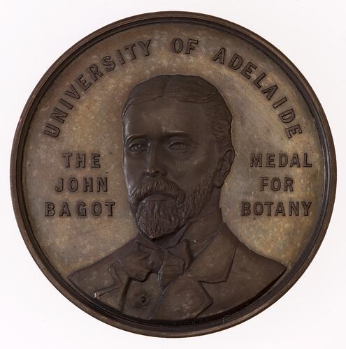 Other Details: University of Adelaide botany prize medal, issued around 1912. It features the bust of John Bagot. The prize was established by his wife, Mrs John Bagot, who donated $1,000 in memory of her late husband. The John Bagot Scholarship is awarded annually to the student who has passed with the highest aggregate mark for the subjects Biology I and Environmental Biology I. If two or more students obtain an equal aggregate score then the $300 prize is shared equally amongst them.
