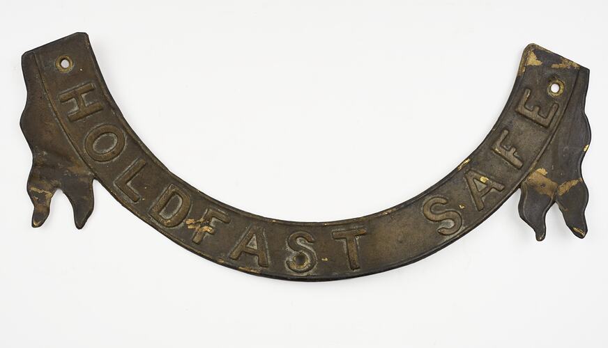 Curved brass plate in shape of a banner with text in relief. Three drilled holes.