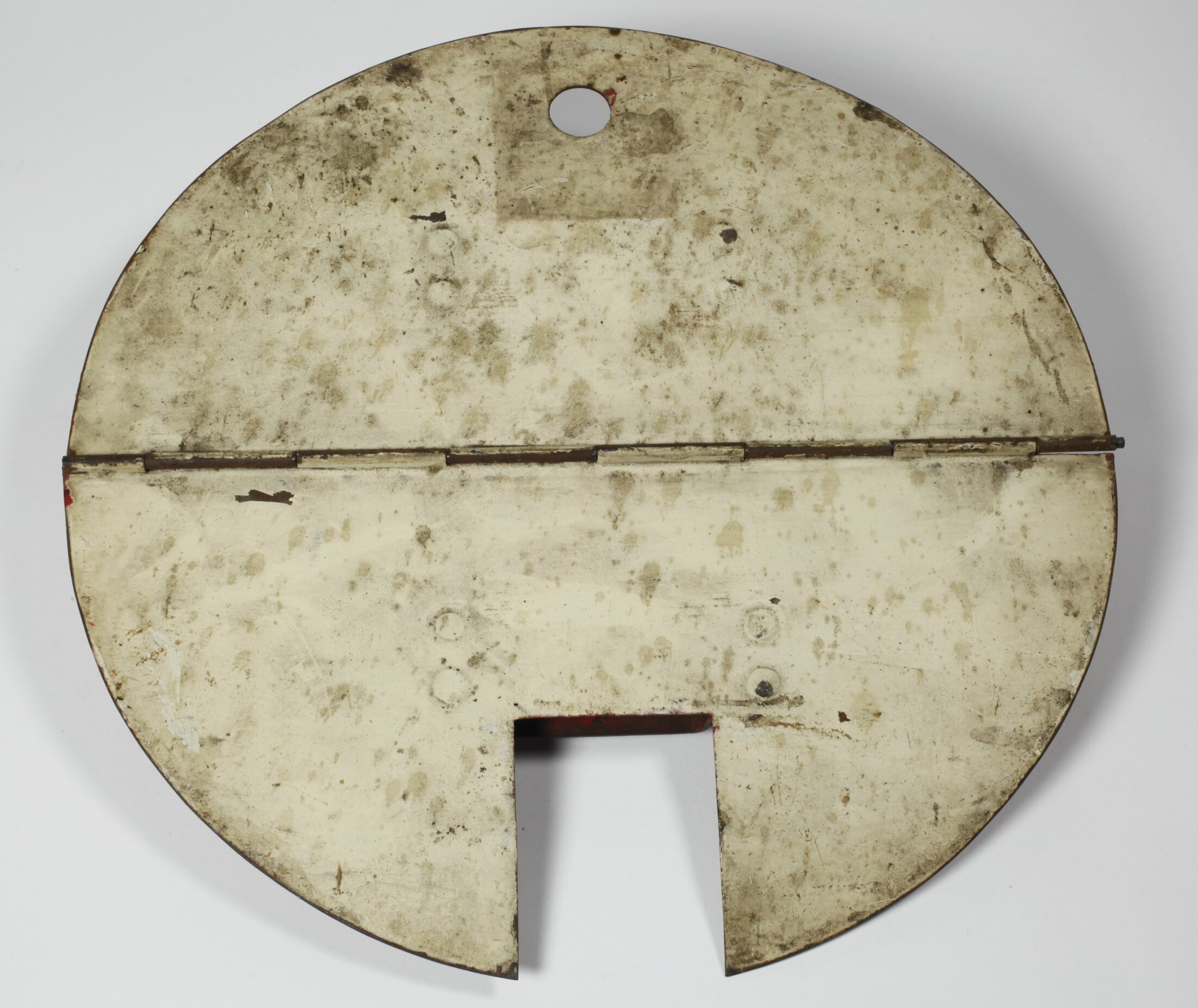 Metal disc with central hinged joint allowing it to be folded in half. One side (front) painted white and the other (back) is painted red. The disc has two riveted straps on the back allowing it to be mounted on a vertical bracket and a rectangular slot below the strap in the lower half. There is also a small circular hole through the centre of the top half of the disc.