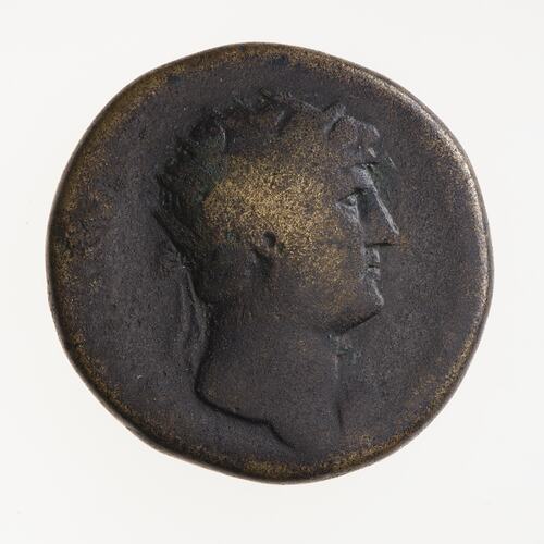 Radiate head of Hadrian facing right, drapery on left shoulder; around, HADRIANVS [AVGVSTVS]