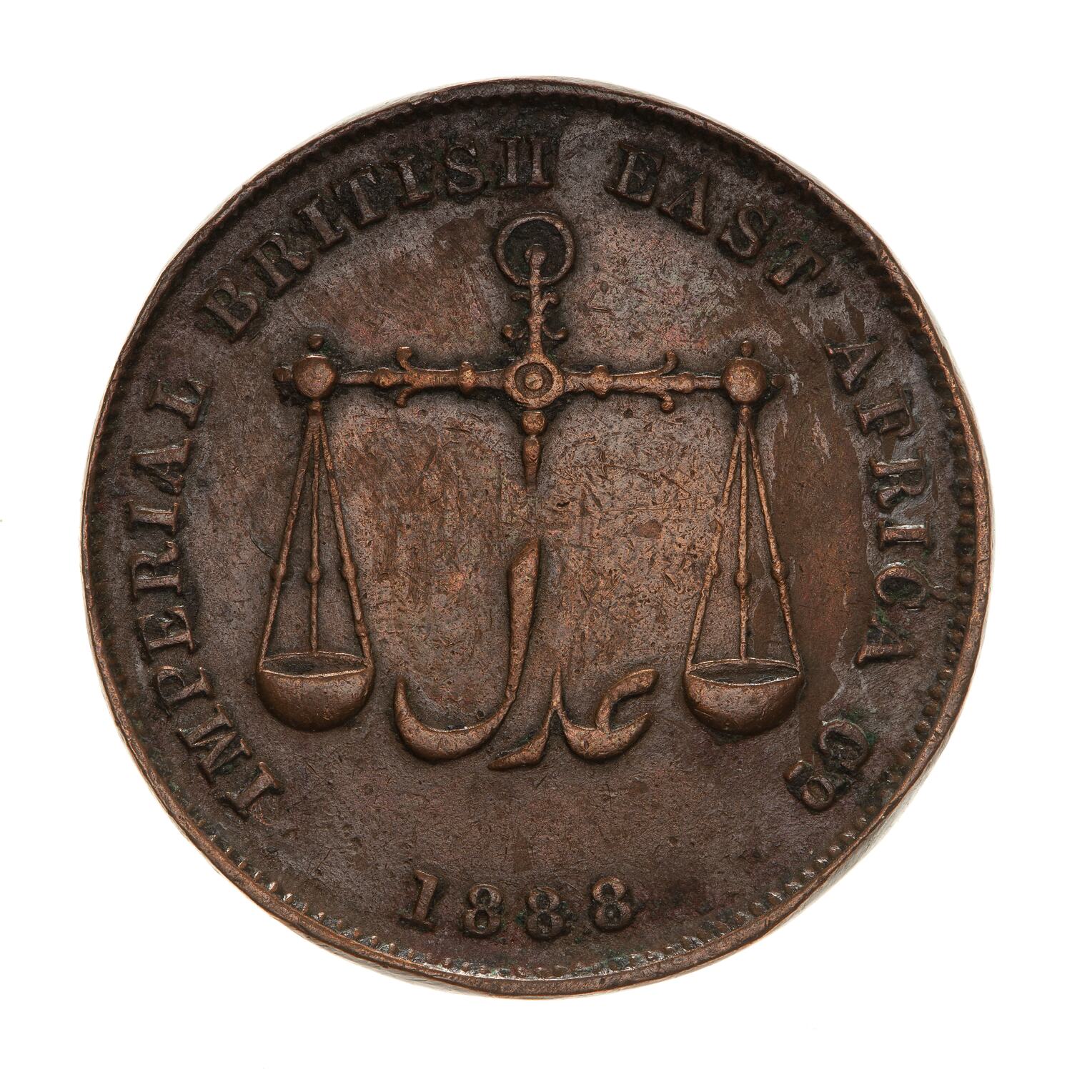 At centre, a balanced set of scales; between pans an Arabic legend; around, IMPERIAL BRITISH EAST AFRICAN COMPANY 1888