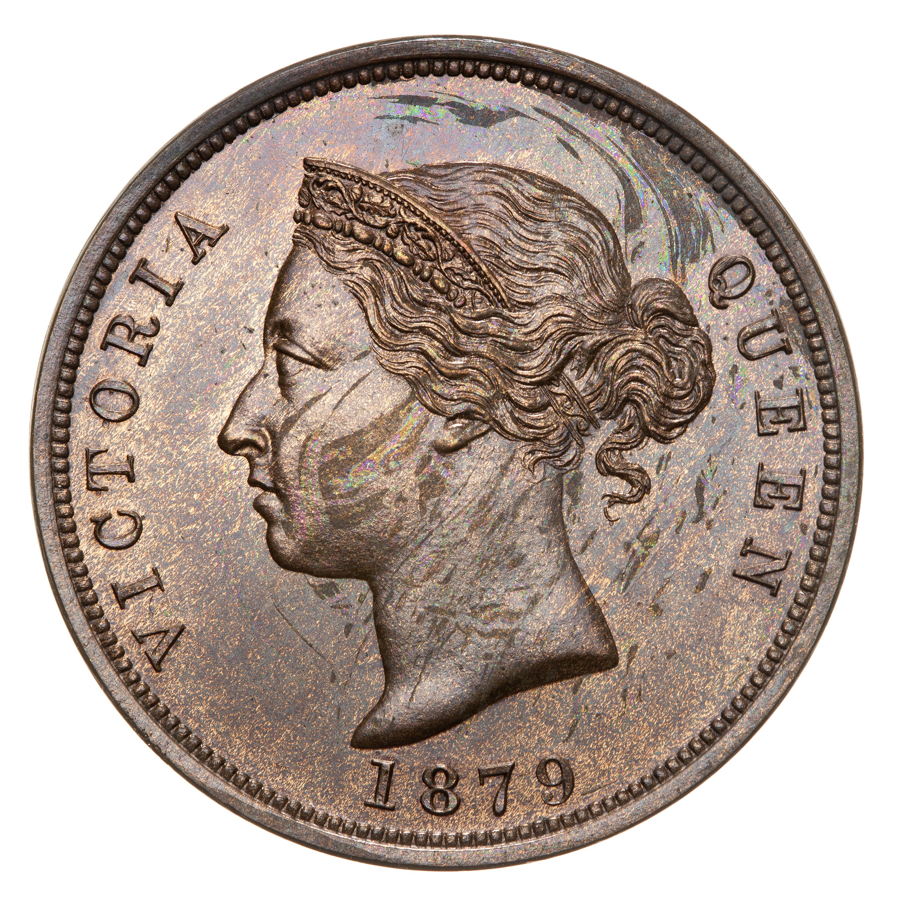 Head of Queen Victoria facing left wearing coronet which is ornamented with oak leaves and acorns; around, VICTORIA QUEEN 1879