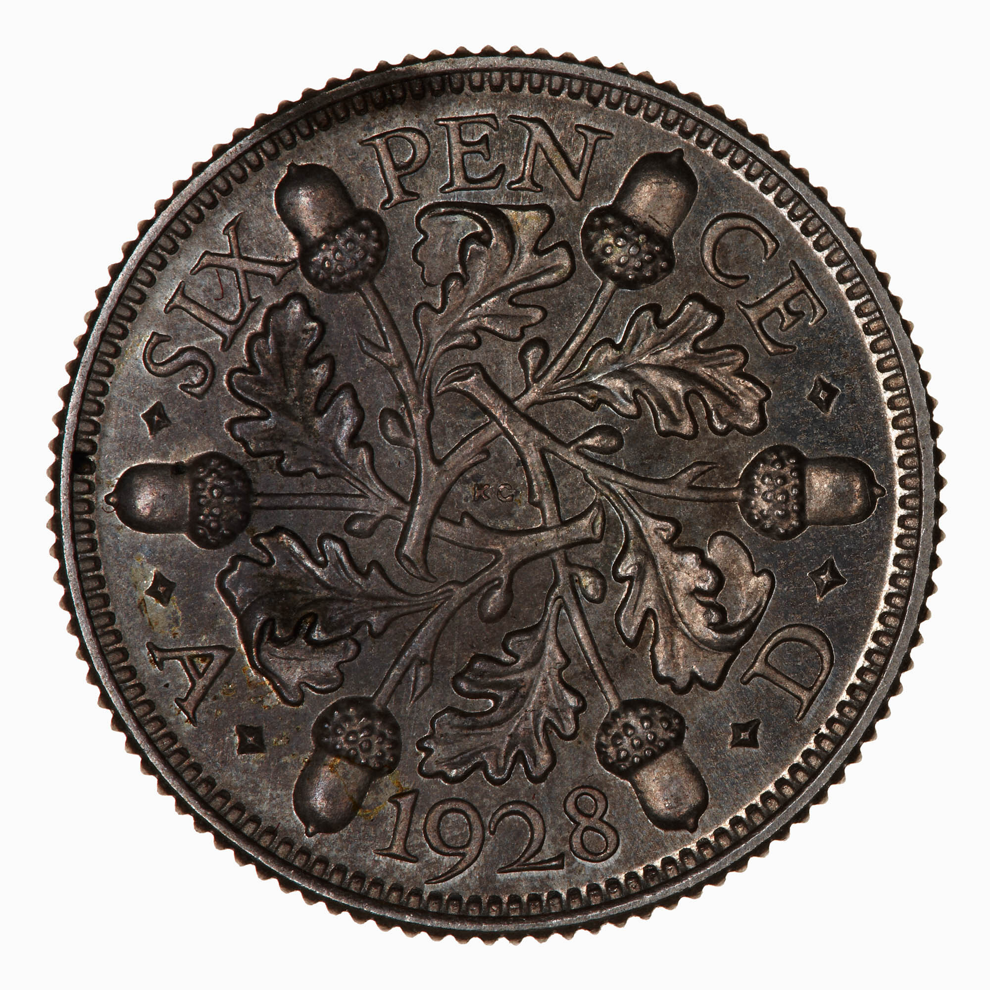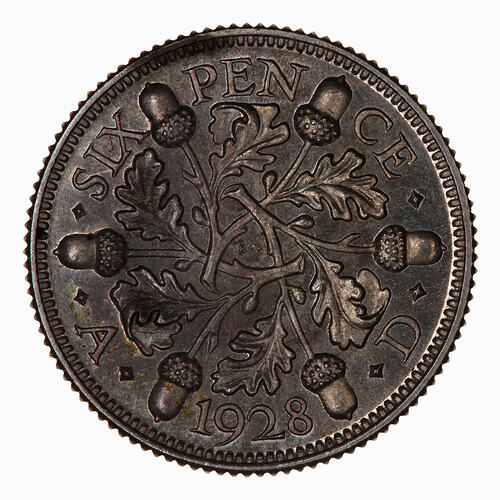 Three sprigs of oak intertwined ending with six acorns; around above, SIXPENCE; around below, A 1928 D