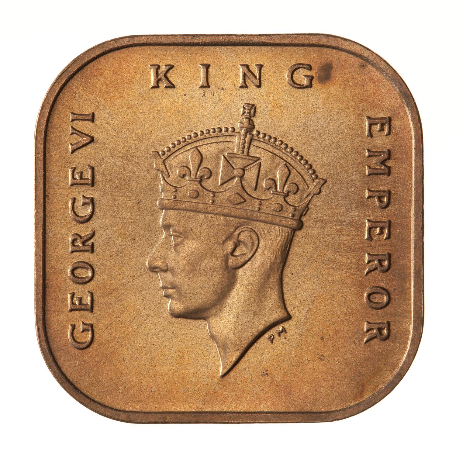 Crowned head of the King facing left; around, GEORGE VI KING EMPEROR; artist's initials, PM, below neck