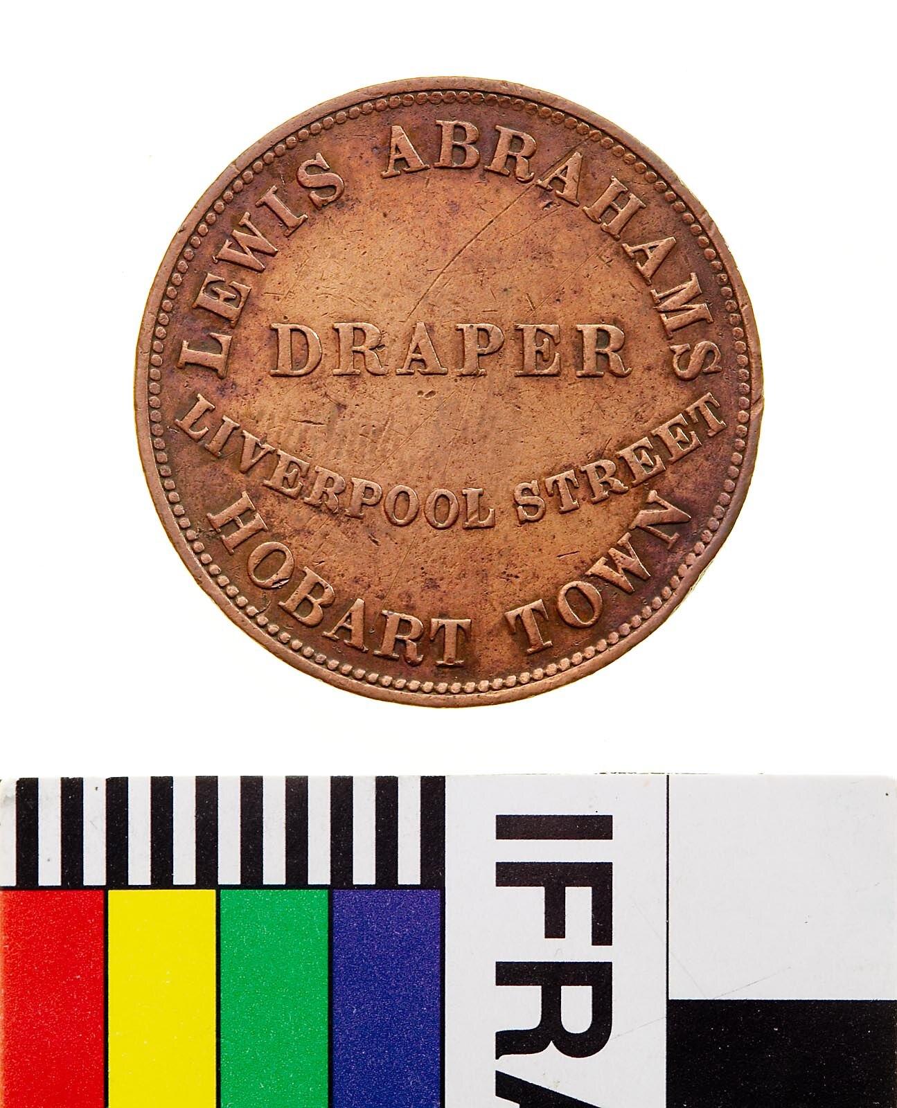 Copper Halfpenny Token, minted by W.J. Taylor, London. Issued by Lewis Abrahams, Drapers, Hobart, Tasmania, 1855. Lewis Abrahams was certainly living in Hobart Town in 1835, records show that he was in partnership with a H.C. Davis in Liverpool Street. He was married in the Jewish Synagogue in December 1855. It appears that Davis withdrew from the partnership and Abrahams carried on alone. He died in Hobart in 1860. Abrahams is mentioned in a number of documents held by the Hobart Hebrew Congregation, he is listed as a contributor to the fund for the construction of the Hobart Synagogue in 1844-1845, and as a 'seatholder' (financial member) of the Hobart Hebrew Congregation.