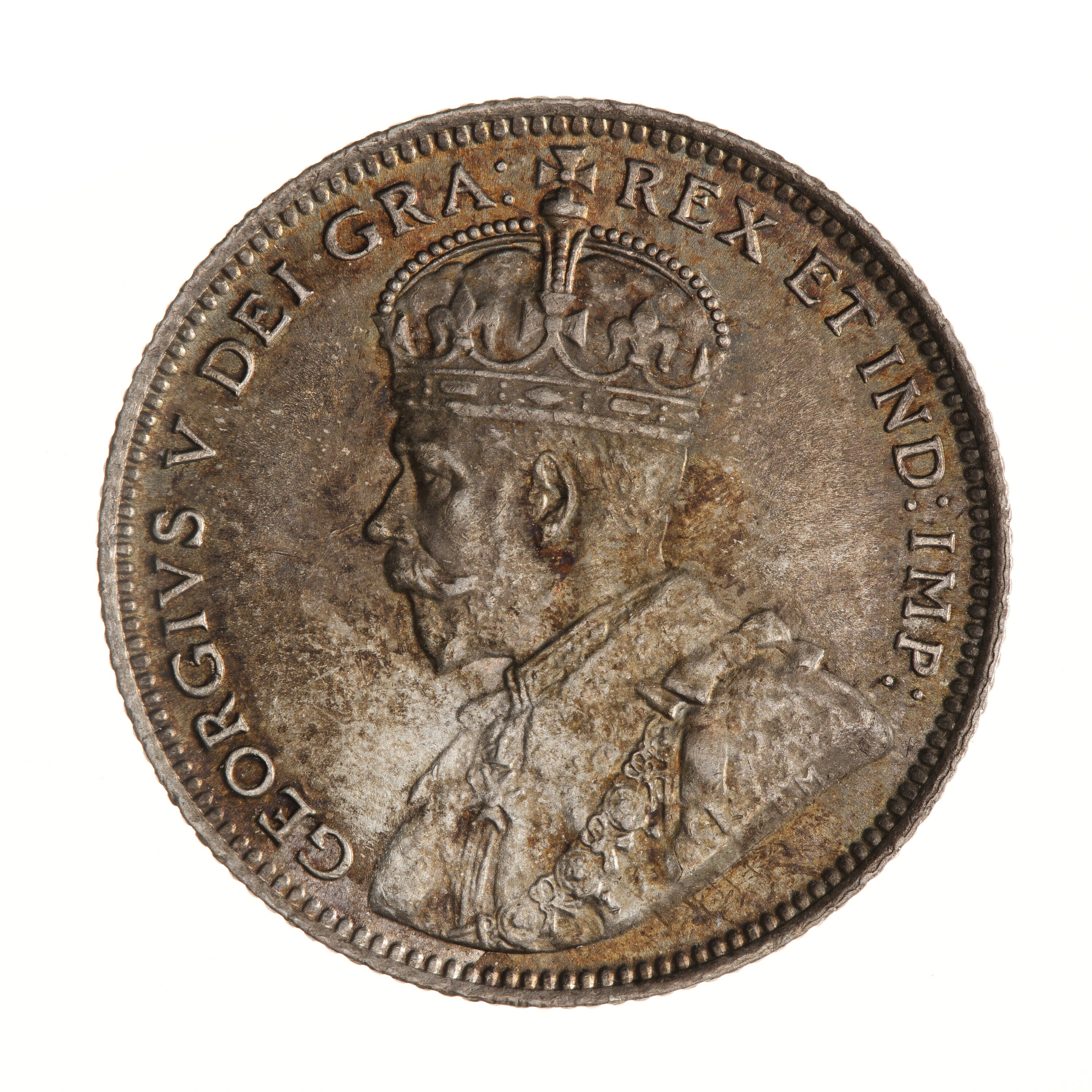 Crowned bust of the King facing left; around, GEORGIVS V DEI GRA: REX ET IND: IMP:; on bust truncation in small letters the artist's initials, B.M.