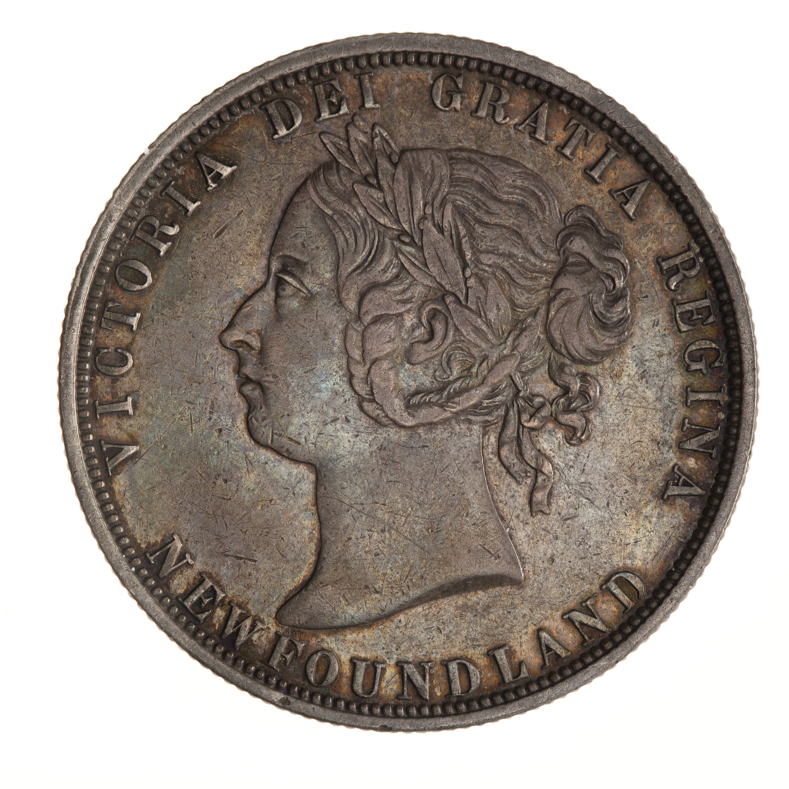 Laureate head of the Queen, with plait of hair falling below the ear, facing left; around below, NEWFOUNDLAND; around above, VICTORIA DEI GRATIA REGINA