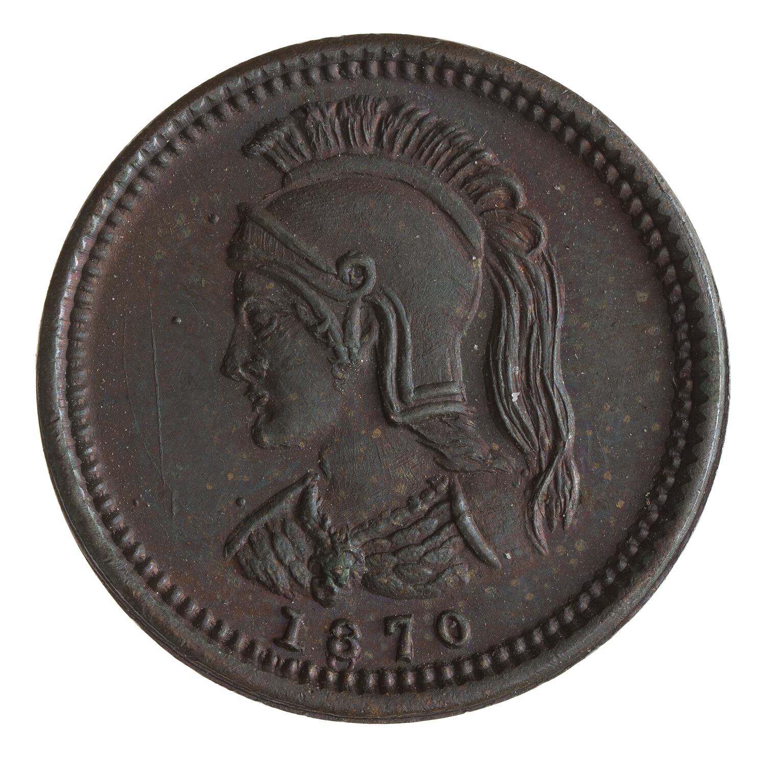 Note: This attribution seems to originate with a coin dealer in 1890. The A on the reverse is thought to be for Anticosti and the attribution has been accepted. However, the island was largely uninhabited so that there would seem to be little call for a local coinage. The letter A has also been interpreted as the mint mark of the Paris Mint but it appears too large to serve this function. It has been argued that the tokens were struck in New York by Lovett using dies intended for a Honduras coinage of 1/8th Real (see KM#30 of Honduras but this issue began in 1869 and the mint mark is the usual small letter A) presumably some time between 1870 and 1890 (there are marks on the obverse suggestive of rusting on the dies). The die work is not of high quality and seems unlikely to be from a major mint.