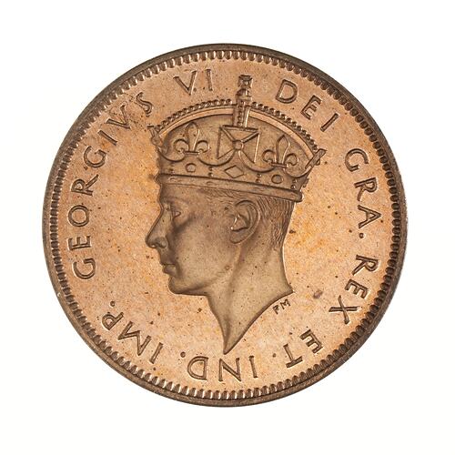 Crowned head ofthe King facing left; around, GEORGIVS VI DEI GRA. REX ET IND. IMP.; artist's initials, P.M., below head