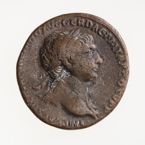 Laureate head of Trajan facing right wearing aegis; around, IMP CAES NERVAE TRAIANO AVG GERM DAC P M TR P COS V P P