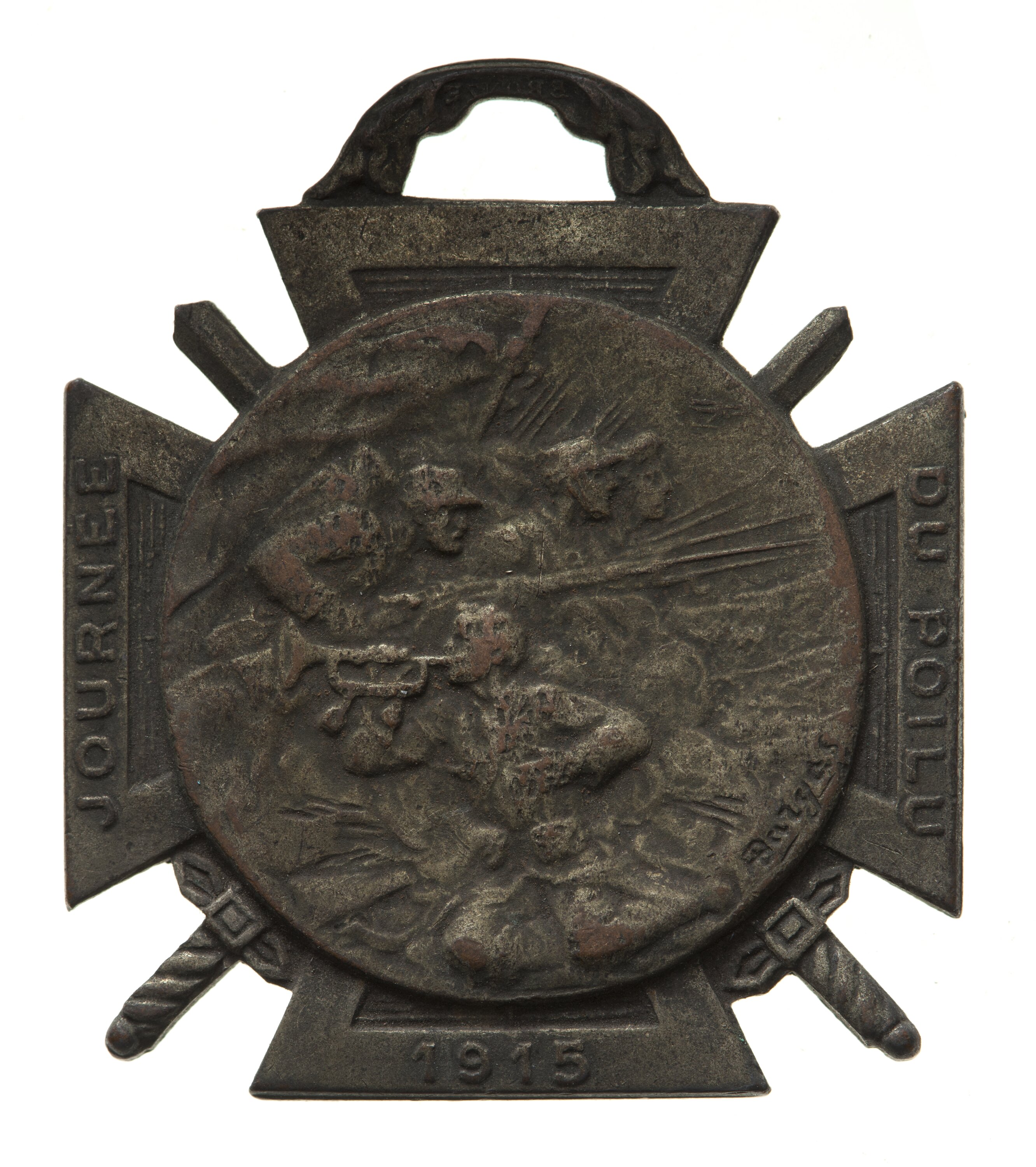 Medal over cross with crossed swords. Central medallion features soldiers in trench attacking to right with a soldier playing a bugle in the foreground. Text on the arms of the cross and reads: "JOURNEE DU POILU 1915".