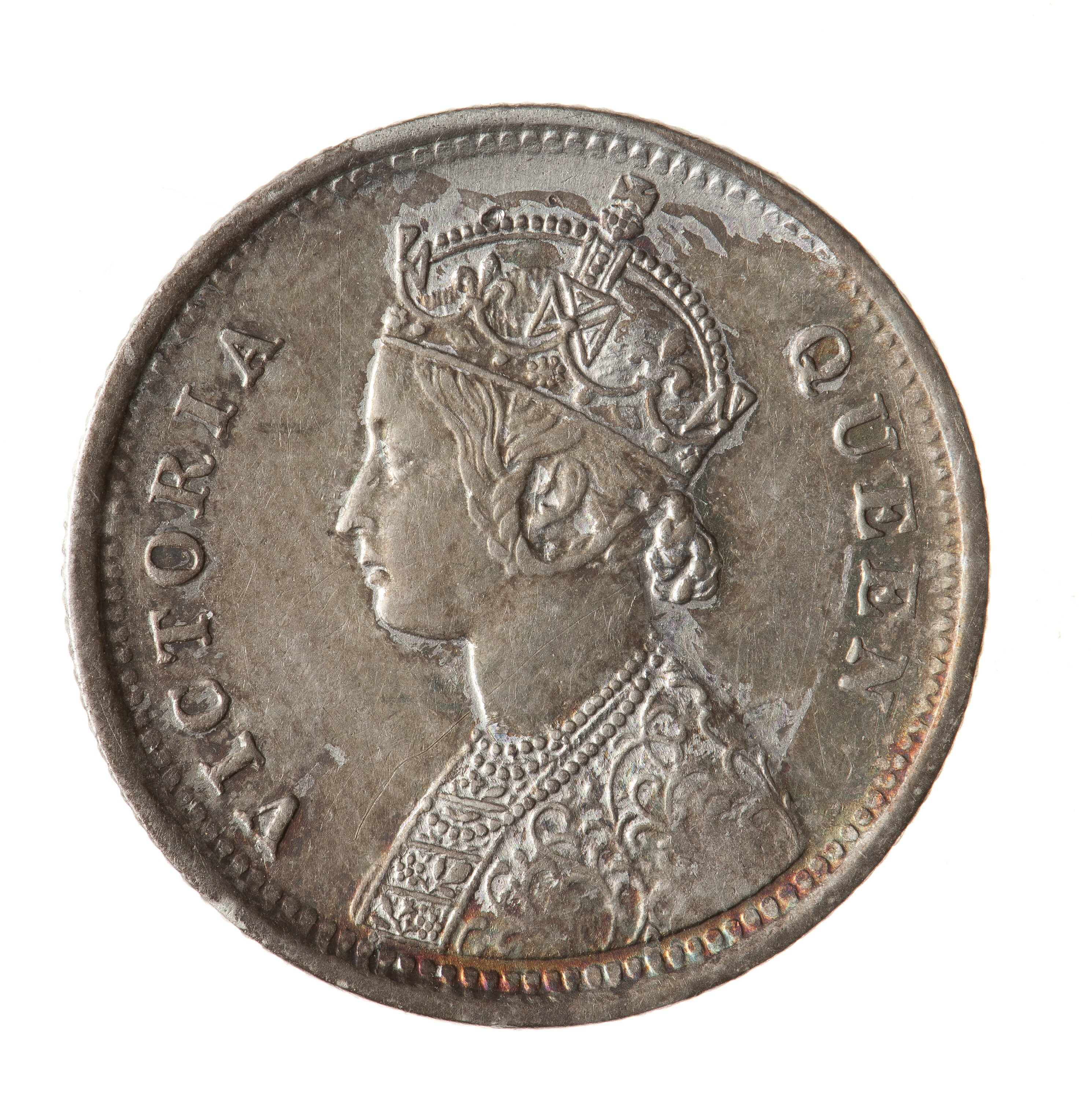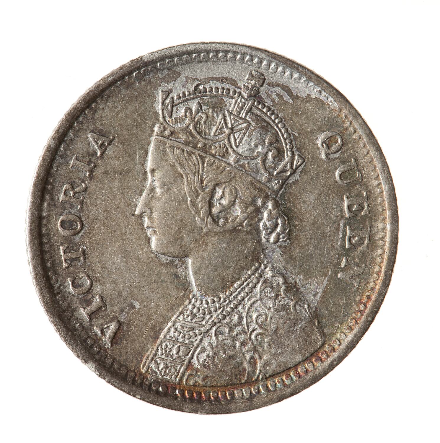 Crowned and robed bust of the queen facing left; around VICTORIA QUEEN (inverted V at centre of bust truncation)