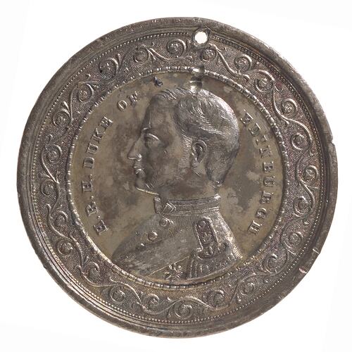 Other Details: Alfred, Duke of Edinburgh, Queen Victoria's second son, was Australia's first royal visitor. Arriving in 1867, he stayed for six months. This medal was the first of four versions issued. It features HMS Galatea, a ship driven by both steam and sail. During his visit to Sydney there was an attempted assassination of the Duke, who received a bullet wound to the back.