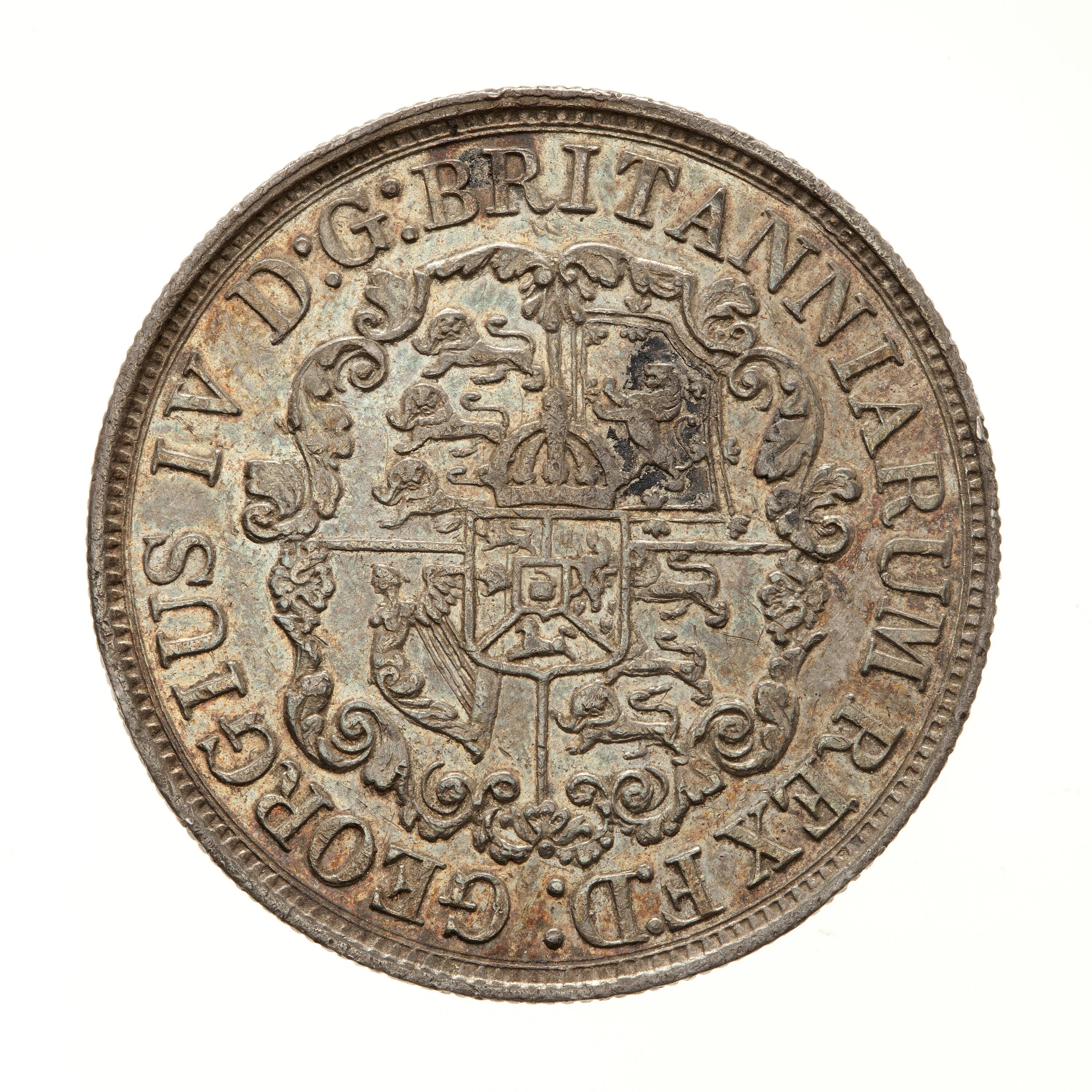 At centre, an ornate shield bearing the arms of King George IV; at centre, the crowned shield of Hanover containing the two lions passant guardant of Hannover, the lion rampant within a semy of hearts of Luneburg and the horse running to the left of Westphalia, quartered around, in I and IV, the three lions passant guardant of England, in II, the lion rampant within a tressure of Scotland, in III, the harp of Ireland; around, GEORGIUS IV D:G: BRITANNIARUM REX F:D: