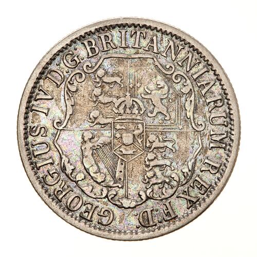 At centre, an ornate shield bearing the arms of King George IV; at centre, the crowned shield of Hanover containing the two lions passant guardant of Hannover, the lion rampant within a semy of hearts of Luneburg and the horse running to the left of Westphalia, quartered around, in I and IV, the three lions passant guardant of England, in II, the lion rampant within a tressure of Scotland, in III, the harp of Ireland; around, GEORGIUS IV D:G: BRITANNIARUM REX F:D: