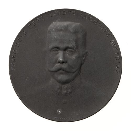 Medal of Archduke Franz Ferdinand made in 1914. The lead medal was made to commemorate Archduke Franz Ferdinand who was assassinated at Sarajevo on 28 June 1914. His death precipitated Austria-Hungary's declaration of war against Serbia.