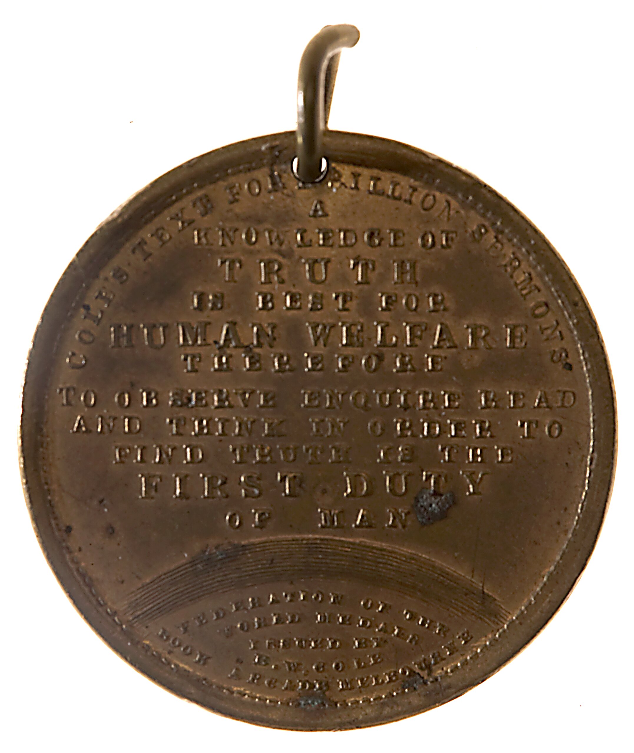 above a rainbow, COLE'S TEXT FOR A BILLION SERMONS / A / KNOWLEDGE OF / TRUTH / IS BEST FOR / HUMAN WELFARE / THEREFORE / TO OBSERVE ENQUIRE READ / AND THINK IN ORDER TO / FIND TRUTH IS THE / FIRST DUTY / OF MAN; below rainbow, FEDERATION OF THE / WORLD MEDALS / ISSUED / BY E.W. COLES / BOOK ARCADE MELBOURNE