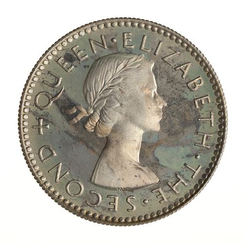 Laureate bust right; around, + QUEEN ELIZABETH THE SECOND; artist's initials incuse on neck truncation, MG (Mary Gillick)