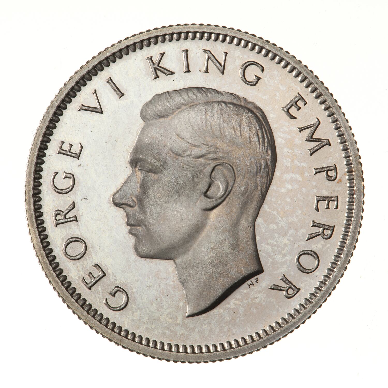 King's head, bare, facing left; around, GEORGE VI KING EMPEROR; below neck truncation in small letters the artist's initials HP ([Thomas] Humphrey Paget)