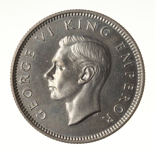 King's head, bare, facing left; around, GEORGE VI KING EMPEROR; below neck truncation in small letters the artist's initials HP ([Thomas] Humphrey Paget)