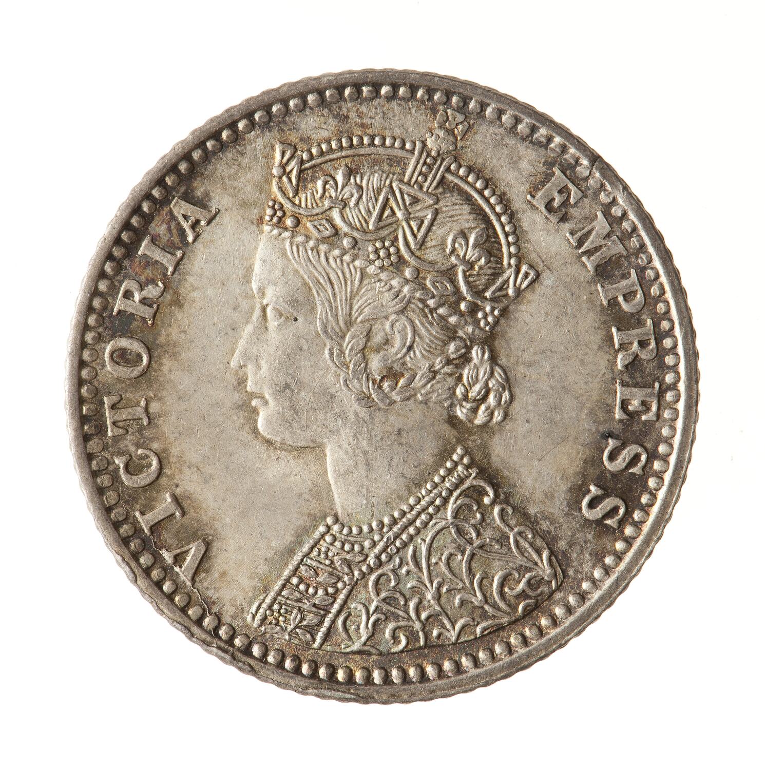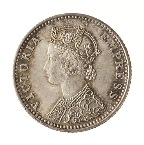Crowned and robed bust of the queen facing left; around VICTORIA EMPRESS